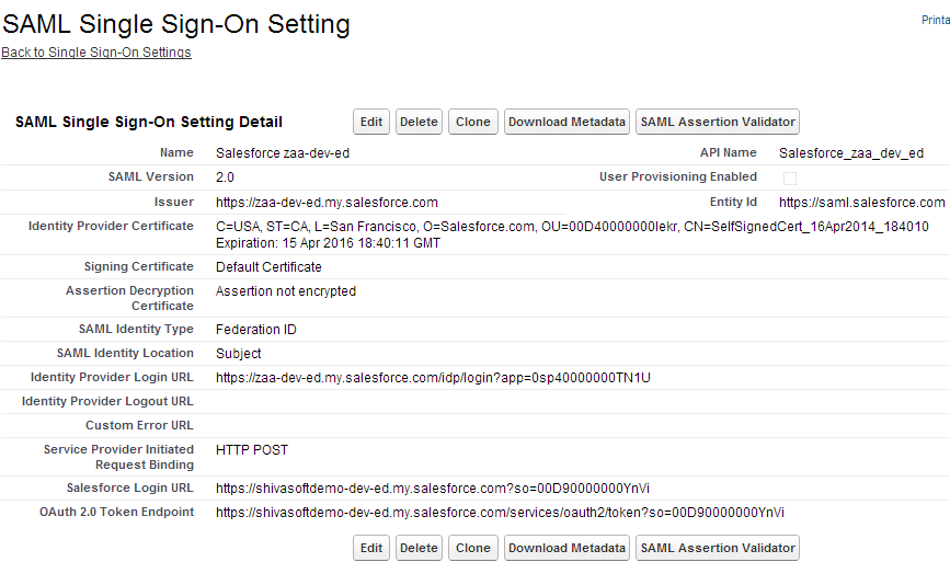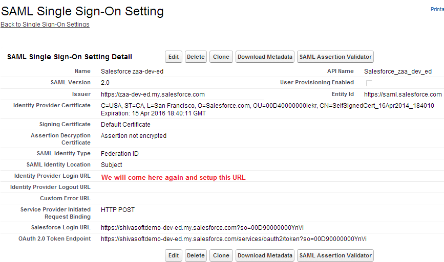 Example : In Identity provider, I have user “zaa.minal1@gmail.com”. Now in Service Provider i have user “zaa.minal@gmail.com” and want to relate this user. So in “Federation Id” field of “zaa.minal@gmail.com” user, I will copy “zaa.minal1@gmail.com”.