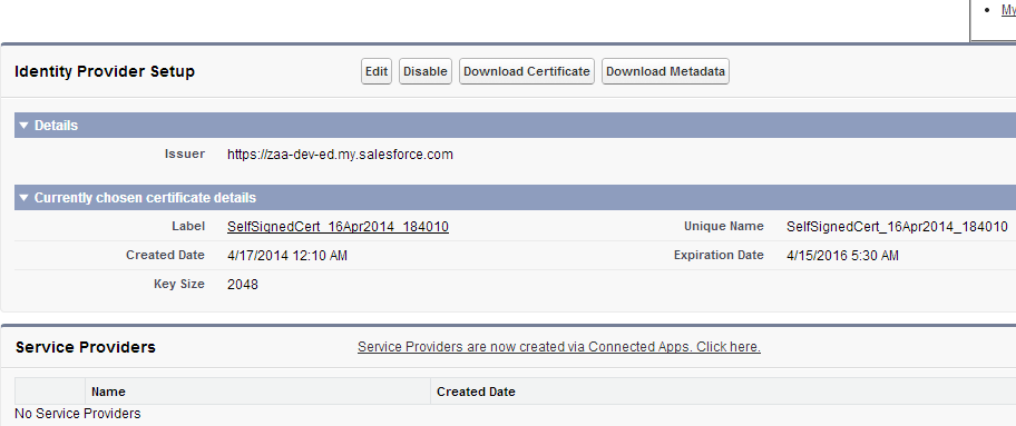 We have to upload certificate downloaded from Identity Provider to here in Service provider while declaring SSO related settings. We have to come back again here to setup “Identity Provider Login URL“, We will get this URL once we define “Connected Apps” in Identity Provider Instance.