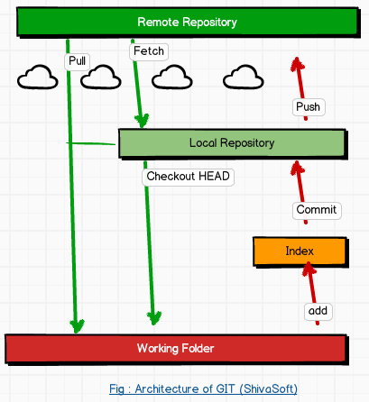 Above figure describes Architect of Git. The one thing to notice in above figure is that Git has local repository as well as remote repository which make it better and more flexible than any other code repository tool.