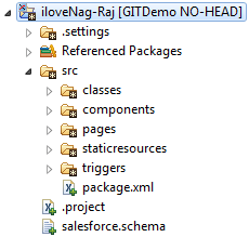 If you check the Salesforce project, the folder will look something like above image with questions marks (“?”) on folders. Question marks means Git does not know what to do with files, either you can schedule them for commit or add few of them in ignore list (means they will not saved in Git).