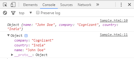 <script> var person = { name : 'John Doe', company : 'Cognizant', country : 'India' }; console.log(person); console.dir(person); </script>